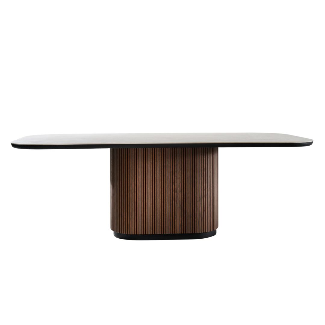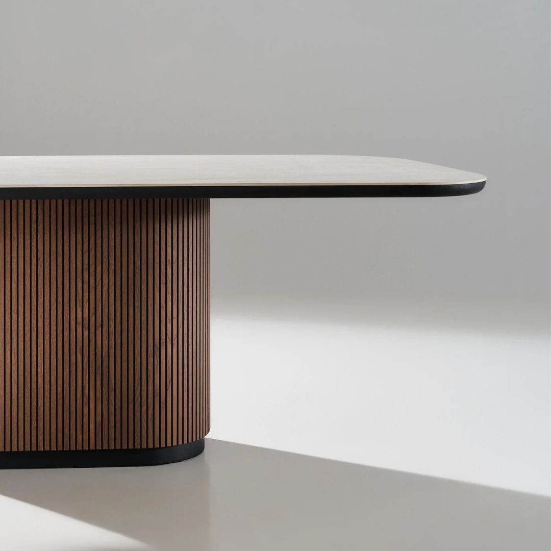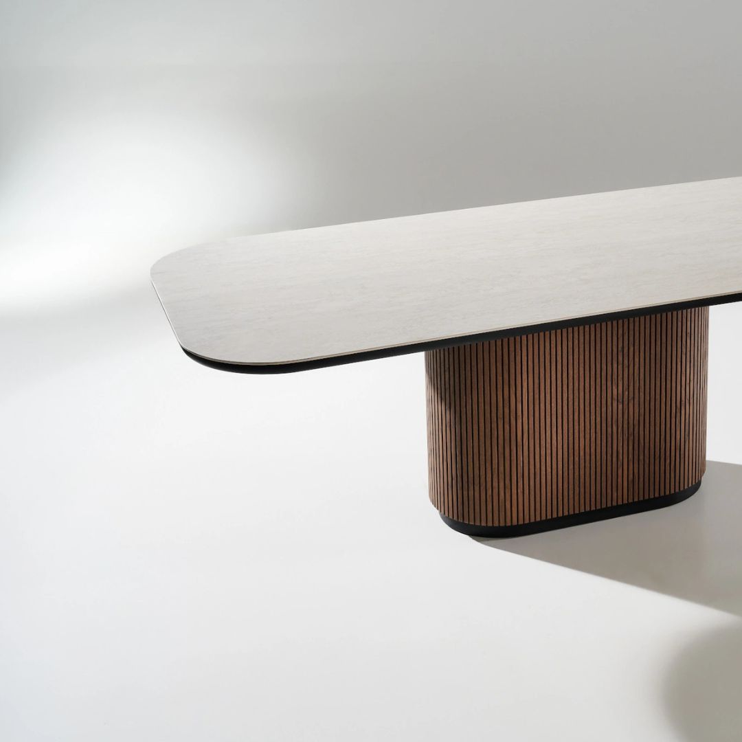 Η τραπεζαρία Noir με επιφάνειά από κεραμικό Travertino αποπνέει φυσική πολυτέλεια και ανθεκτικότητα ενώ η βάση του τραπεζιού ξεχωρίζει για την καμπυλωτή της γραμμή και την επένδυση με κάθετα πηχάκια σε ζεστή καρυδιά.